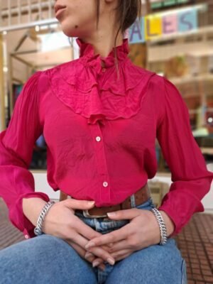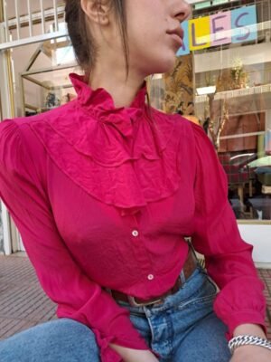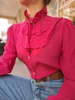 Φούξια σατεν πουκάμισο με ruffle γιακα