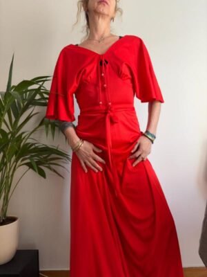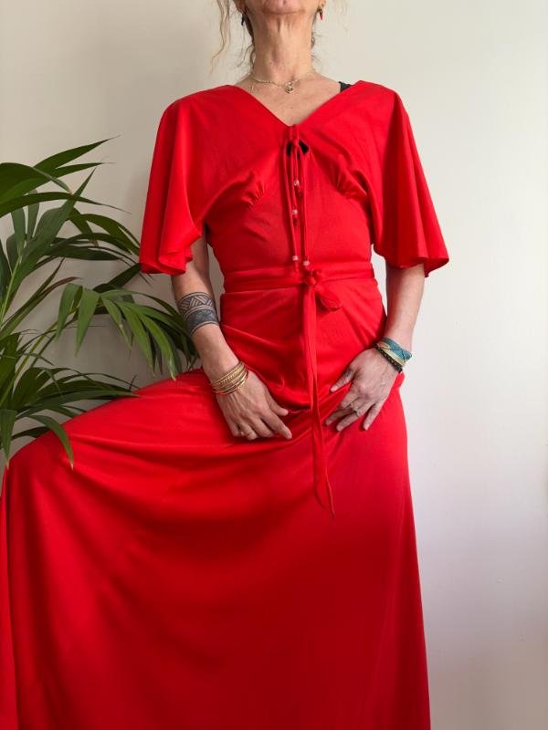 70’s vintage bright red super maxi flowy dress with flutter sleeves