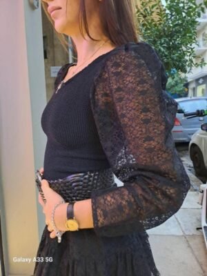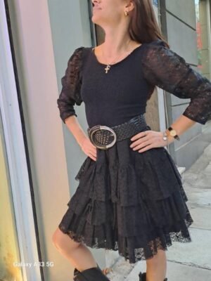 80’s vintage black lace midi dress with puff sleeves, fitted waist and tiered lace skirt