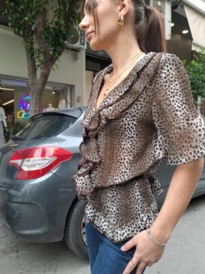 vintage animal print blouse with frills and subtly goldish