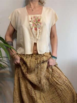 vintage beige boho super maxi skirt with metallic fibres elastic waist