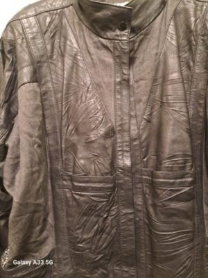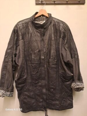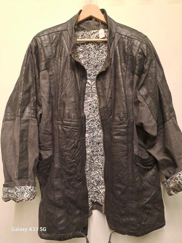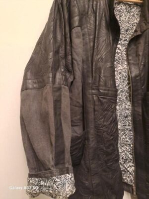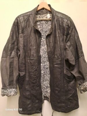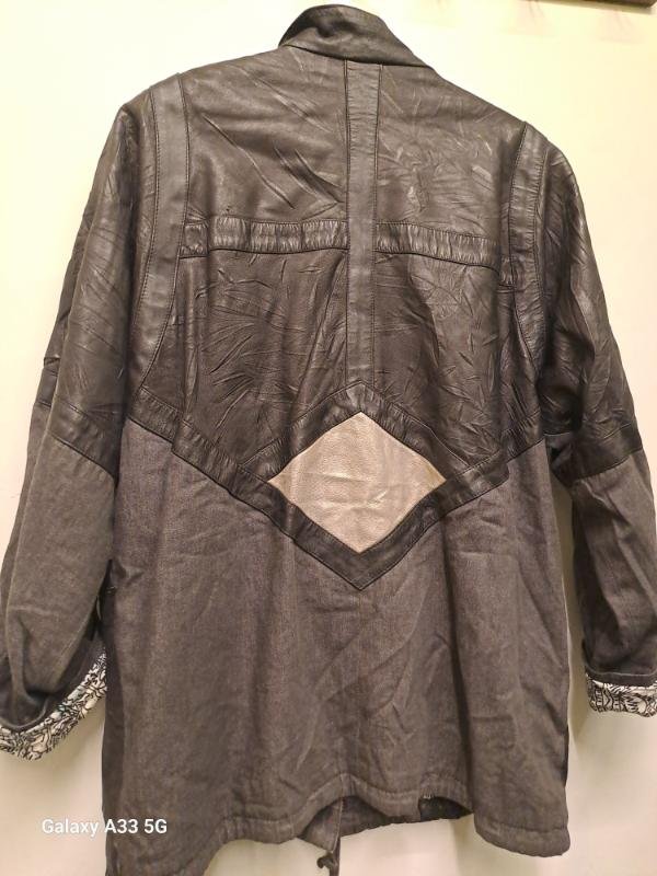 vintage black & grey patchwork leather and denim oversize jacket with geometric back silver diamond panel