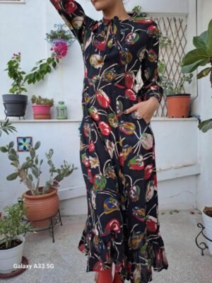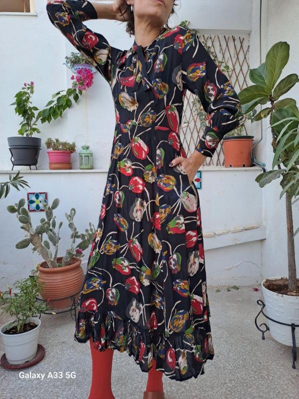 vintage black midi floral ruffle dress