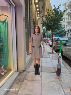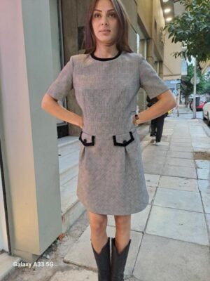 vintage check mini dress with black velvet trims and front pocket details