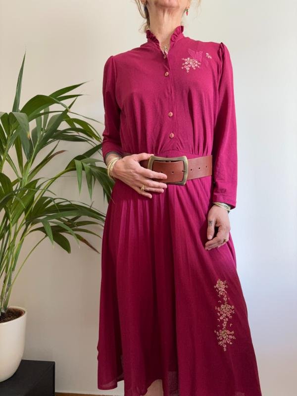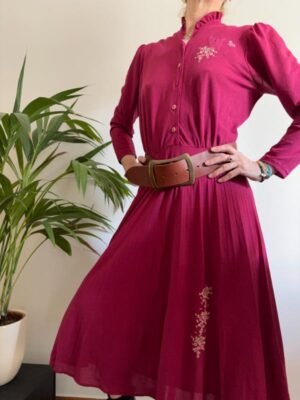 vintage rasberry midi dress with pleats,elastic waist, floral embroidery and ruffle collar