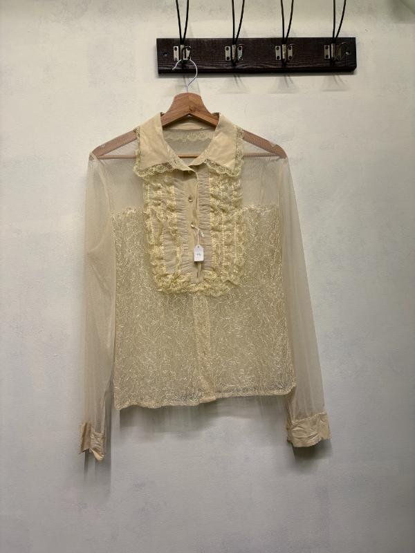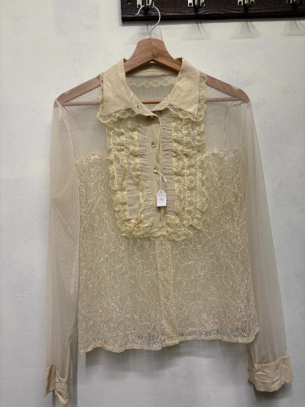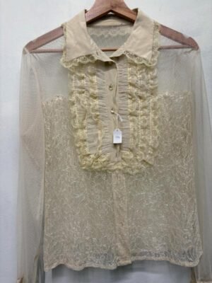 vintage romantic ivory lace sheer shirt with lace ruffle along the front