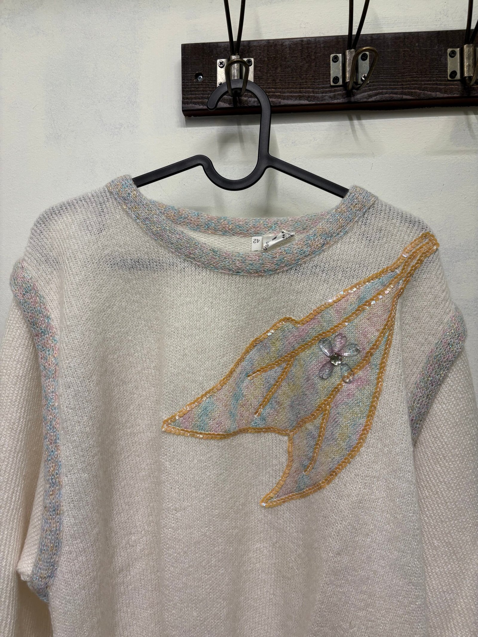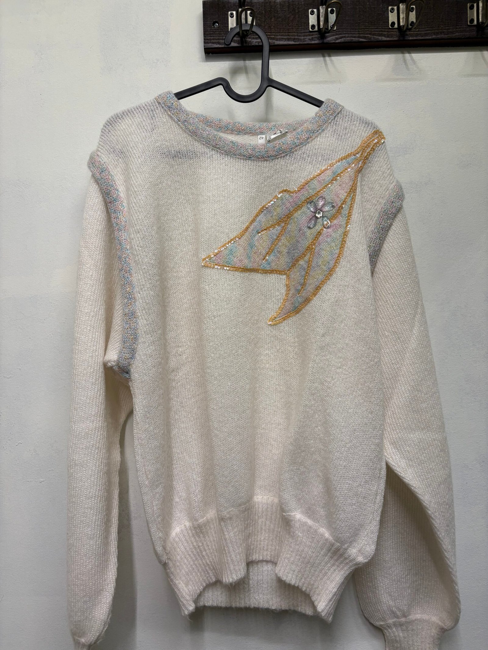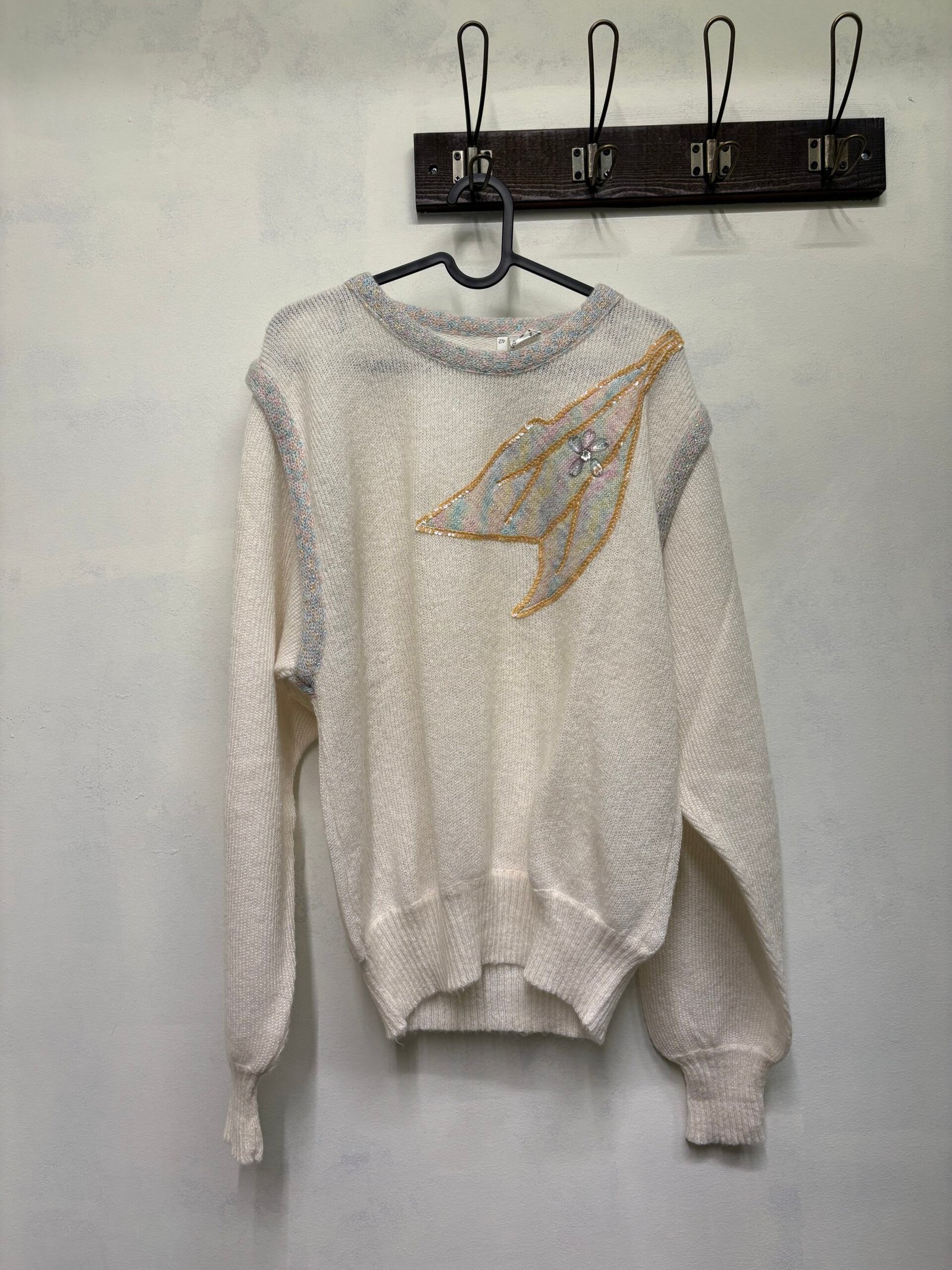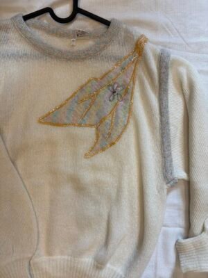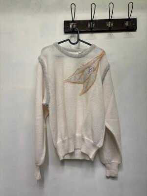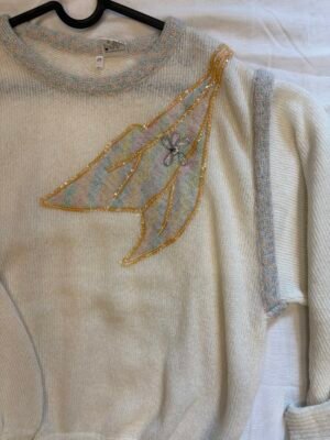vintage romantic knitted cream sweater with embelishment and metallic fibres