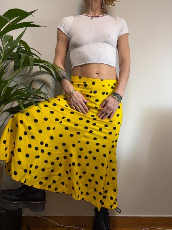 vintage viscose yellow & black polka dot maxi flare skirt