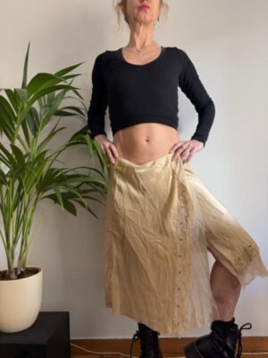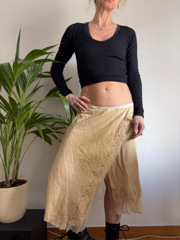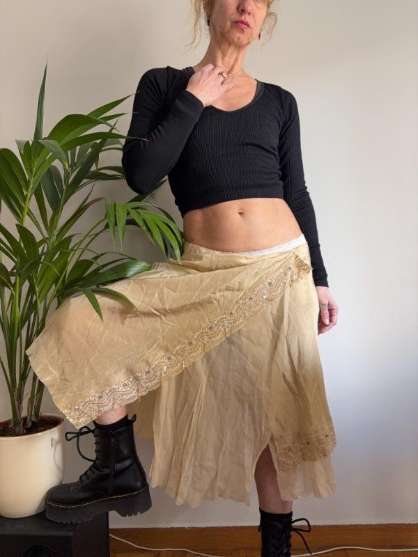 vintage y2k flowy silk beige gold asymmetric midi skirt with lace trims